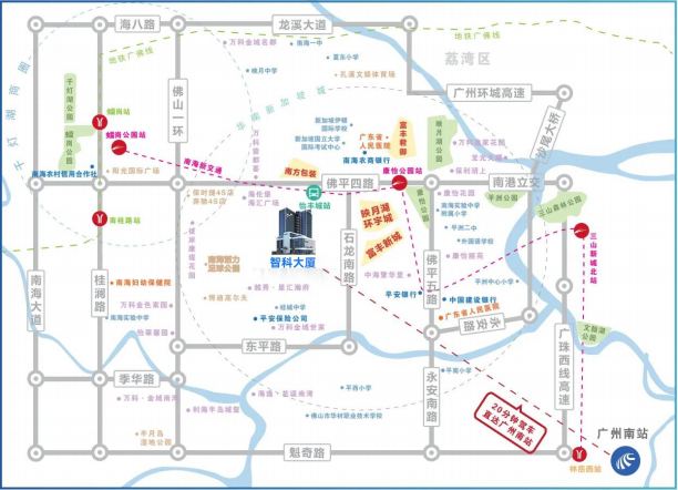智科大廈地處南海桂城映月湖板塊佛山總部經濟集聚區黃金位置,該區域是南海區委區政府和桂城街道著力打造的高科技總部經濟商務圈,是廣東金融高新區和廣州南站經濟圈的黃金交匯點,5分鐘即達廣州荔灣、番禺,跨越廣佛雙城,坐享廣佛雙城融合發展帶來的海量信息流、物流、資金流等,以及數以億計的龐大客流、人才流集城市品質、公共配套、人才聚集和區位優勢于一身。