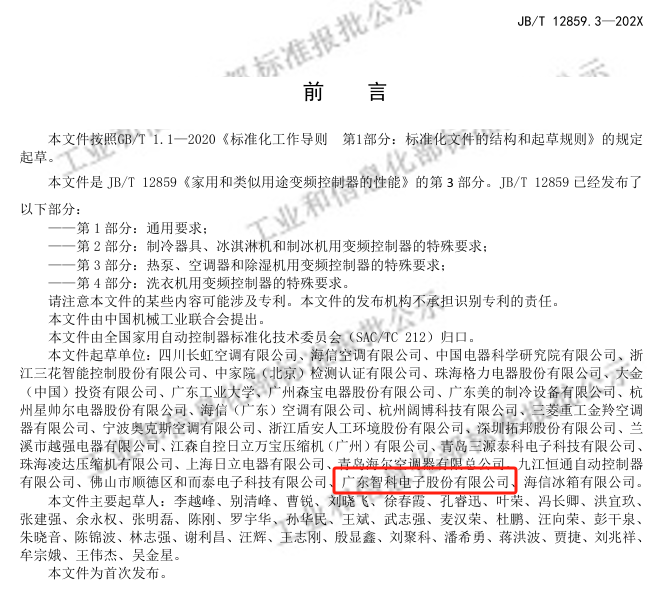 近日,智科股份在行業標準領域再傳佳音,企業參與的行業標準JB/T 12859.3-2024《家用和類似用途變頻控制器的性能 第3部分:熱泵、空調器和除濕機用變頻控制器的特殊要求》已經公示。這一里程碑式的成就,不僅彰顯了智科股份在變頻控制器技術領域的領先地位,更體現了其對行業規范與發展所做出的巨大貢獻。