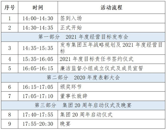為表彰2020年度優(yōu)秀集體和個人,宣貫集團(tuán)2021-2025年戰(zhàn)略規(guī)劃及2021年度發(fā)展思路,促使上下達(dá)成管理共識,統(tǒng)一思想、統(tǒng)一計(jì)劃、統(tǒng)一行動,確保集團(tuán)年度目標(biāo)的實(shí)現(xiàn),特舉辦2021年度經(jīng)營目標(biāo)發(fā)布會暨2020年度表彰大會?,F(xiàn)就會議相關(guān)事宜通知如下: